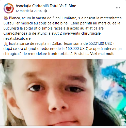 ”Bianca, acum in vârstă de 5 ani jumătate, s-a născut la maternitatea Buzău, iar medicii au spus că este bine. Când părinții au mers cu ea la București la un spital pentru o simplă răceală, au aflat că are Craniostenoză și de atunci au urmat 2 intervenții chirurgicale nesatisfăcătoare. Există șanse de reușita in Dallas, Texas suma de 55221,80 USD ( după ce s-a obținut o reducere de la 160.000 USD) acoperă intervenția chirurgicală de remodelare fronto-orbitală. Restul investigațiilor, transportul, cazarea, se achită separat!”, scriu reprezentanții Asociației Totul va fi bine.