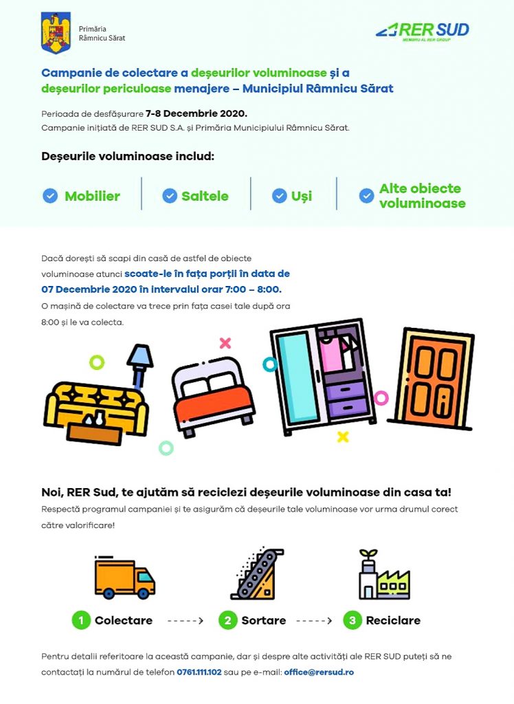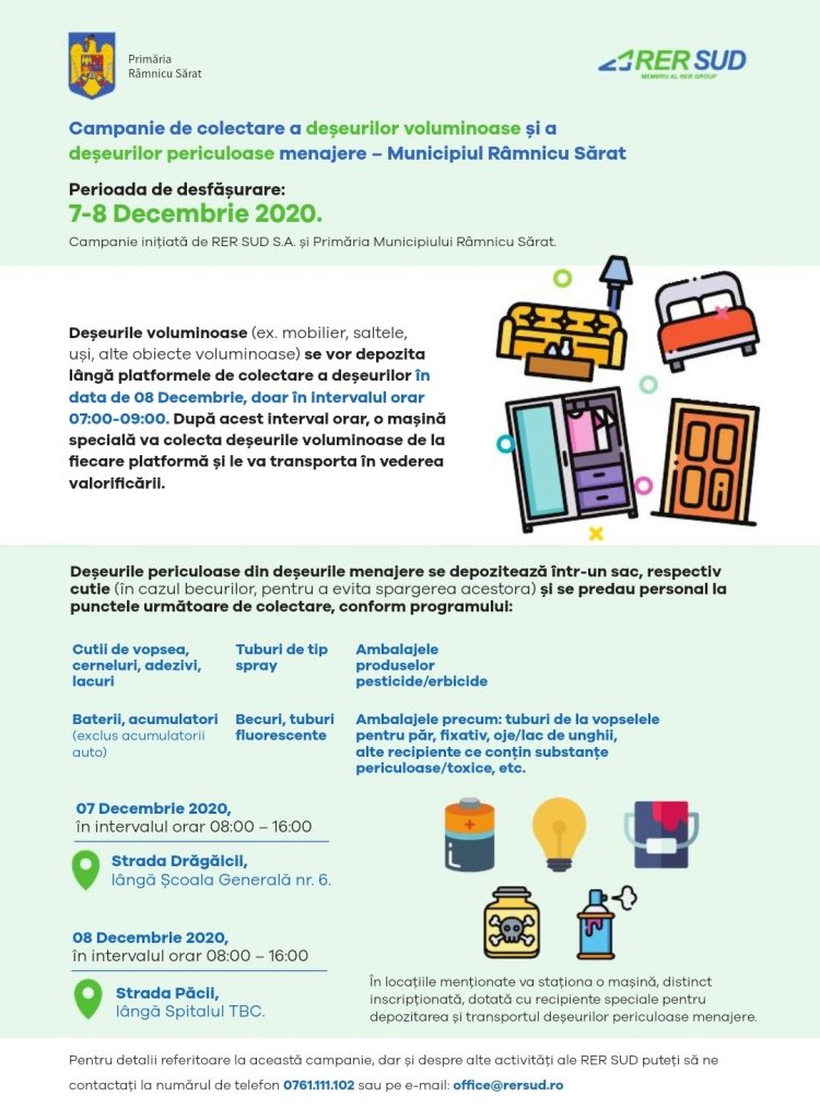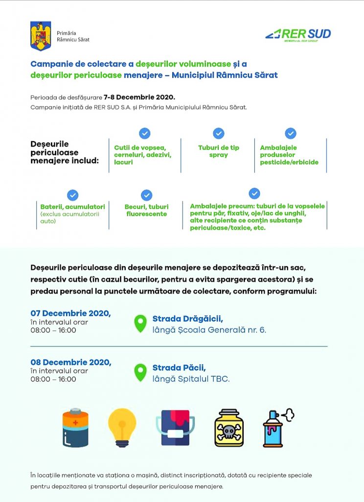S.C. RER SUD S.A. demarează primele campanii de informare și colectare a deșeurilor voluminoase și a celor periculoase provenind din deșeurile menajere generate de populația municipiului Râmnicu Sărat. Cele două campanii se vor desfășura concomitent în perioada 7-8 decembrie.