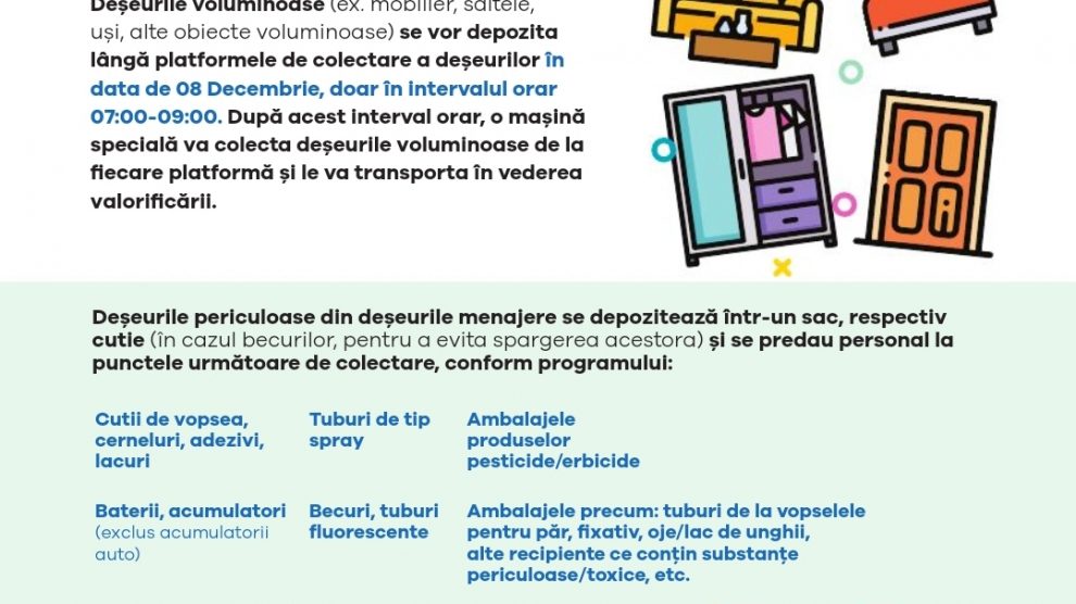 ”După aceste intervale orare, o mașină specială va trece prin fața fiecărei case, respectiv pe la fiecare platformă și va colecta deșeurile voluminoase”, informează RER.