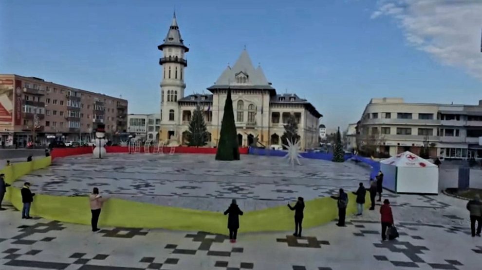 Un imens tricolor a înconjurat astăzi Piața Daciei, gestul fiind unul care să marcheze Ziua Națională altfel decât prin obișnuitele manifestări de 1 Decembrie.