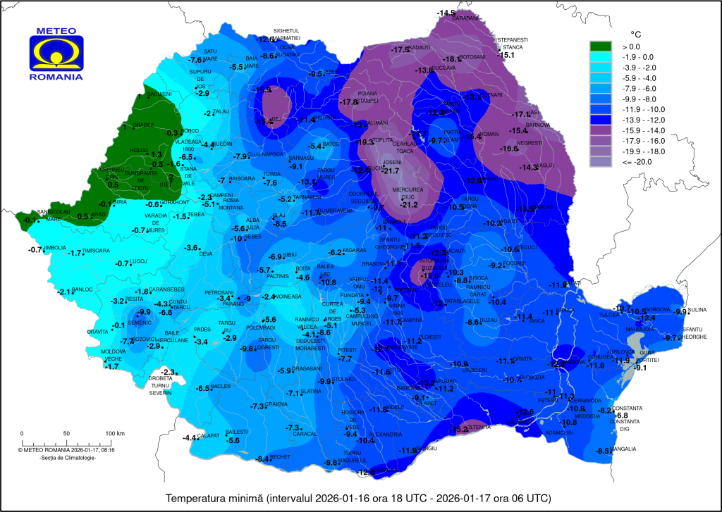 “În Moldova, Dobrogea, Muntenia, Oltenia, Transilvania, Maramureș și în nordul Crișanei vremea va fi geroasă. Temperaturile minime se vor situa în general între -20 și -10 grade”, anunță ANM.
