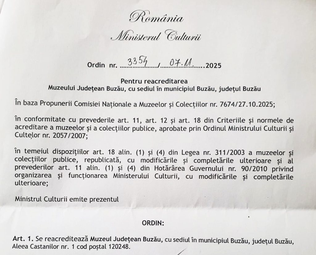 Muzeul Județean Buzău a obținut reacreditarea din partea Minsiterului Culturii, în urma unui proces riguros de evaluare, care a vizat atât activitatea expozițională, programele educaționale, cât și conservarea patrimoniului. O reușită care vine ca o recunoaștere a tuturor eforturilor făcute de reprezentanții instituției de cultură, în ultimii ani, și care confirmă, încă o dată, statutul instituției ca reper cultural și științific la nivel regional și național.