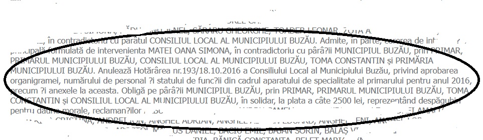 Interesant este că plata despăgubirilor către polițiștii concediați ar urma să fie făcută, în solidar, de Primăria Buzău, primarul Constantin Toma și consilierii locali municipali de la acea dată. Extras din soluția instanței, mai jos: