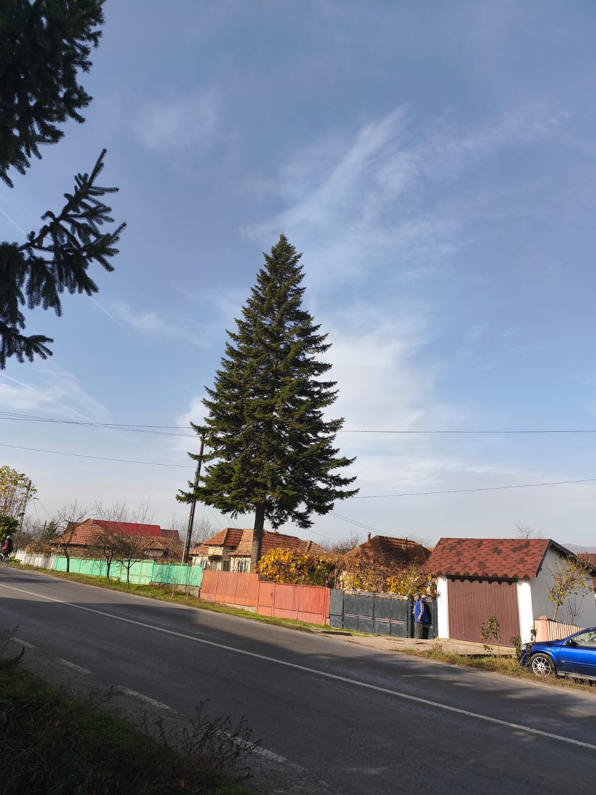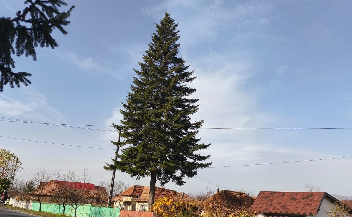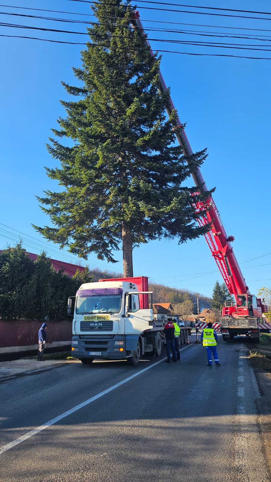 Este un brad falnic, care, de 62 de ani, a crescut lângă locuința familiei din Unguriu și care a pus transportatorii la grea încercare.