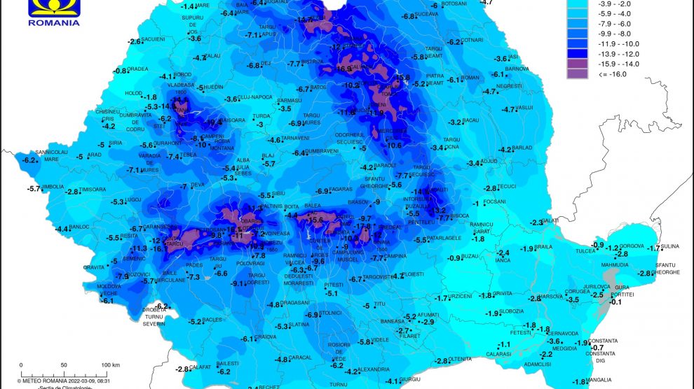 ”Temperaturile minime vor fi cuprinse între -14 și -4 grade, cu valori mai scăzute în depresiunile din estul Transilvaniei, izolat sub -18 grade.