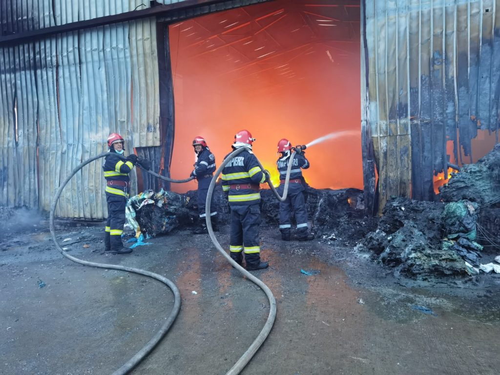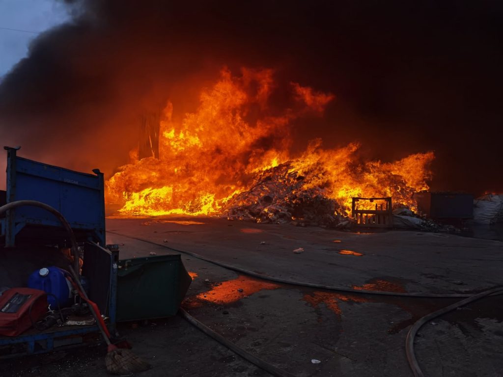 Imagini incredibile surprinse marți seară dar și miercuri dimineață la incendiul de proporții care a cuprins o hală în care erau depozitate materiale reciclabile.