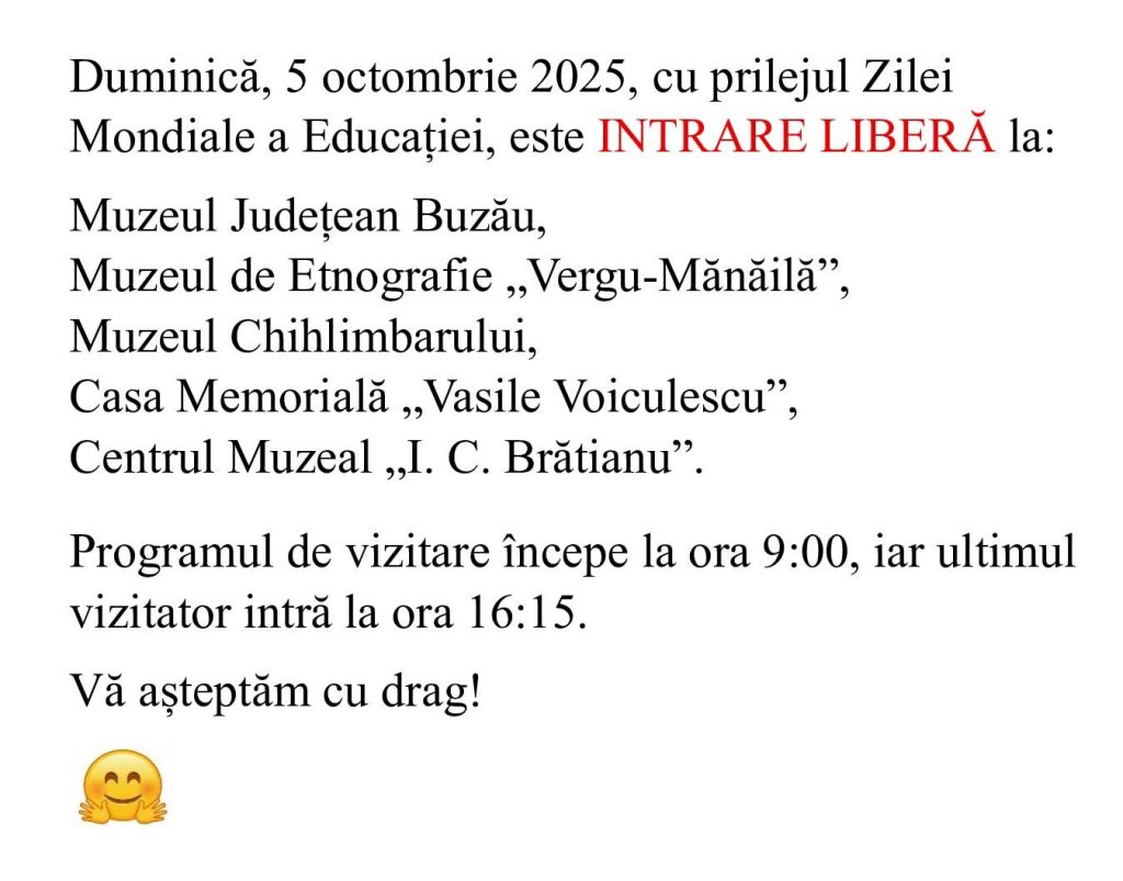 De Ziua Mondială a Educației intrarea la muzeu este liberă! Astfel, toți cei care vor ajunge astăzi la atât la sediul principal de pe Nicolae Bălcescu cât și la oricare dintre secțiile exterioare ale Muzeului Județean Buzău, inclusiv Centrul Muzeal ”I.C.Brătianu” pot vizita gratuit toate expozițiile.