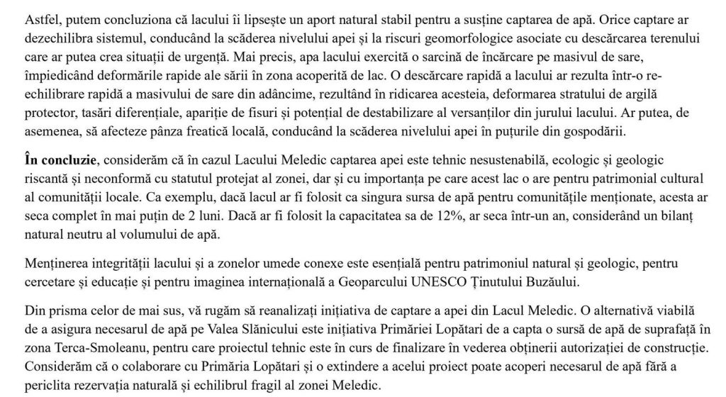 La rândul lor, reprezentanții Geoparcului Ținutul Buzăului au transmis o informare autorităților județene, arătând că decizia de captare a apei din Lacul Meledic, lac de apă dulce format pe un masiv de sare, nu este o soluție sustenabilă și, în plus, încalcă statutul de zonă protejată în cadrul geoparcului. Măsura poate afecta iremediabil lacul, acesta putând seca în circa 2 luni, arată reprezentanții geoparcului.