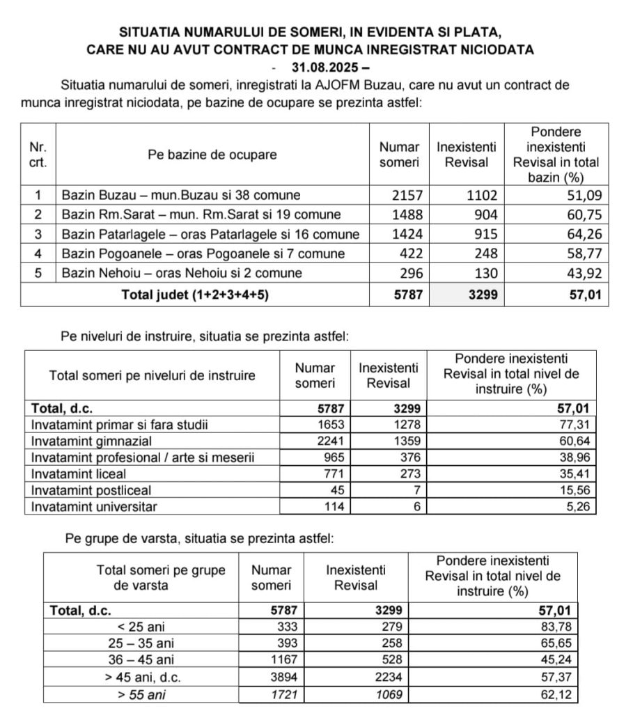 ”La șfârșitul lunii august 2025, numărul total de șomeri înregistrati în evidentele AJOFM Buzau a fost de 5787 persoane, înregistrându-se o creștere cu 40 persoane față de luna iulie, când în evidențele instituției erau 5747 persoane. Rata șomajului la sfirșitul lunii august 2025, calculată cu o populație activă de 143.300, este de 4,04%, în crestere fata de luna iulie (4,01%)”.