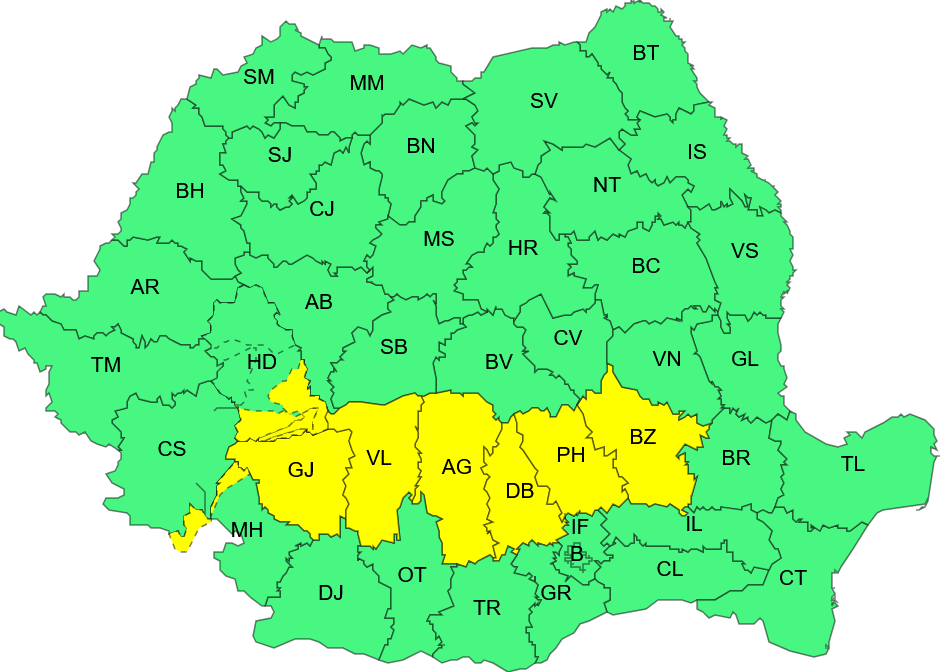 “Pe durata intervalului 28 noiembrie, ora 12:00 – 30 noiembrie, ora 24:00, este activ Codul Galben, pe anumite sectoare de râuri din județele: Gorj, Brașov, Covasna, Sibiu, Vâlcea, Argeș, Olt, Dâmbovița, Prahova, Ilfov, Ialomița și Buzău: râul Buzău – bazin amonte Ac. Siriu şi afluenţii aferenţi sectorului aval Ac. Siriu – amonte S.H. Baniţa (judeţele: Braşov, Covasna, Buzău şi Prahova).”