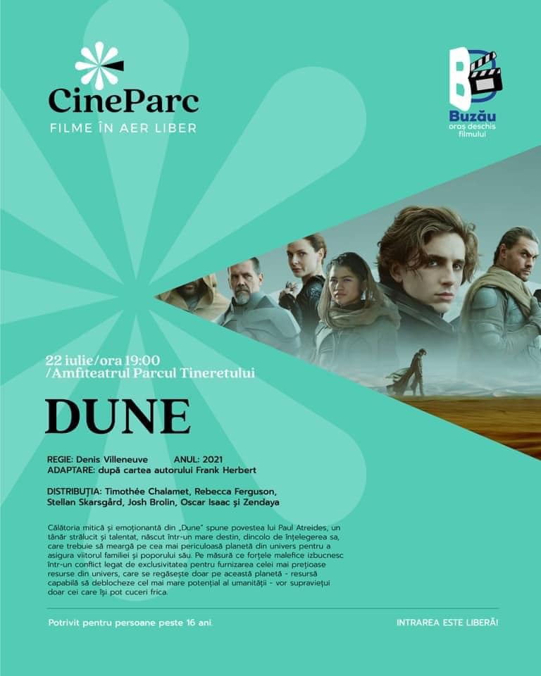 “CineParc Buzău începând cu 22 iulie. Revenim la serile de cinema din Amfiteatrul parcul Tineretului cu producții pentru toate categoriile de vârstă. Vă așteptăm în fiecare zi de vineri/sâmbătă/duminică începând cu ora 19:00 să vă bucurați de filme în aer liber.