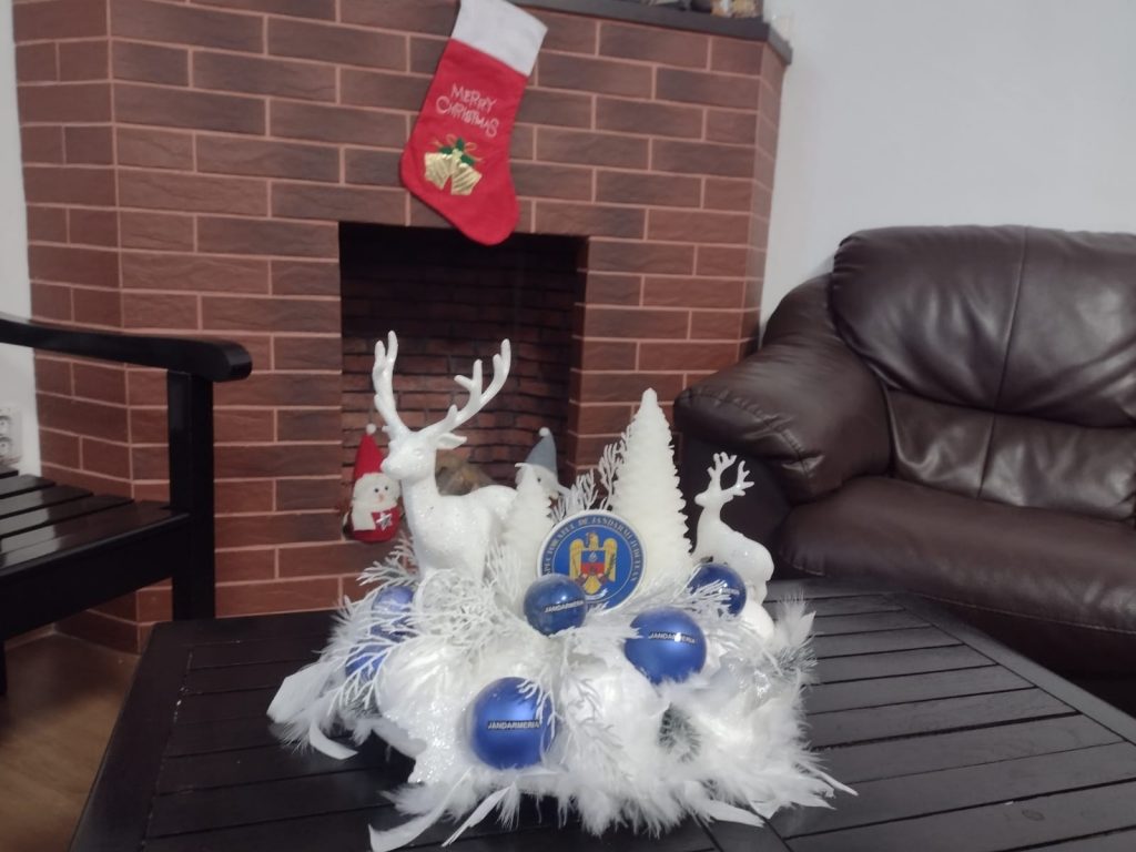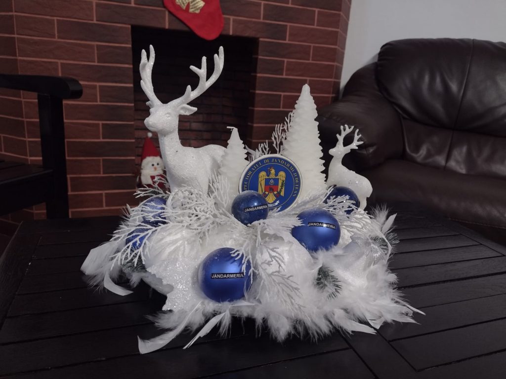 Spiritul Crăciunului i-a cuprins și pe angajații în uniformă. Dacă polițiștii au ales un brad artificial decorat în roșu și argintiu, jandarmii sunt mai inventivi. Aici, un coleg a confecționat mai multe aranjamente specifice sărbătorilor de iarnă , iar în centrul atenției este chiar sigla Inspectoratului de Jandarmi Județean.