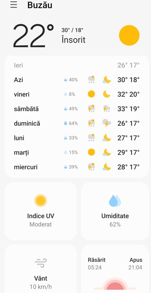 Vara își intră în drepturi. Începând de joi temperaturile vor depăși 30 de grade Celsius la umbră. Cea mai călduroasă zi va fi cea de sâmbătă când termometrele vor arăta, la Buzău, 33 de grade Celsius. În toată perioadă vântul abia dacă va adia, iar șansele de precipitații sunt minime, ceea ce înseamnă un disconfort termic accentuat și un aer greu de respirat.