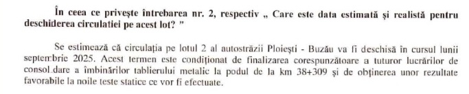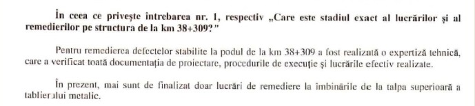 Potrivit răspunsului, podul care a ținut lotul închis până acum, deși ar fi trebuit deschis încă din decembrie anul trecut, e gata. A fost realizată o expertiză tehnică, fiind verificate documentația de proiectare, procedurile de execuție și modul efectiv în care s-au realizat lucrările, iar acum mai sunt de finalizat lucrările de remediere la îmbinările de la talpa superioară a tablierului metalic.