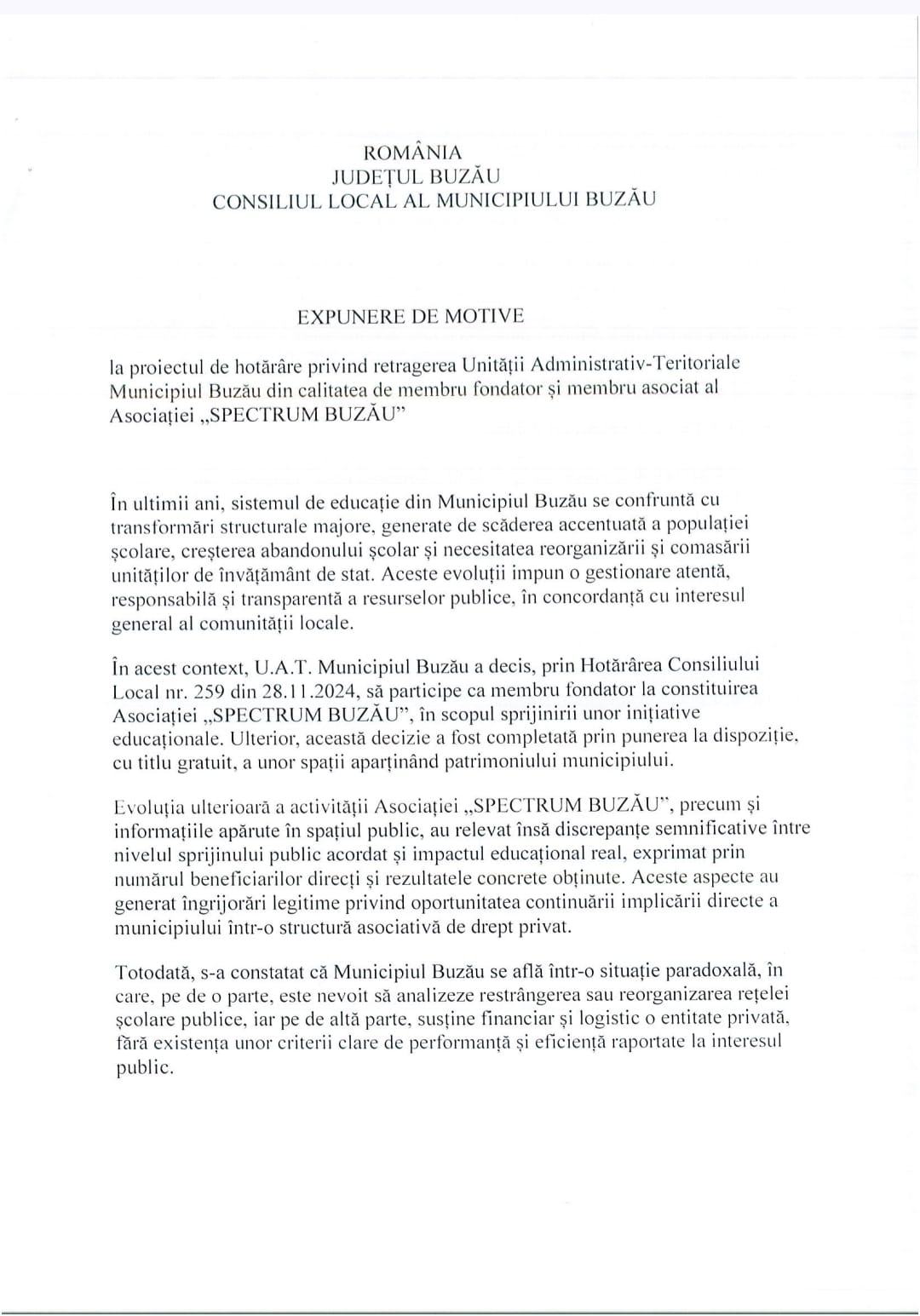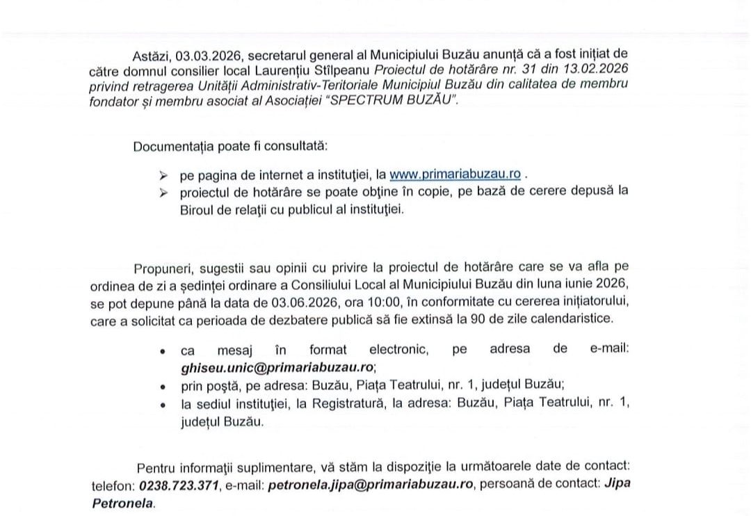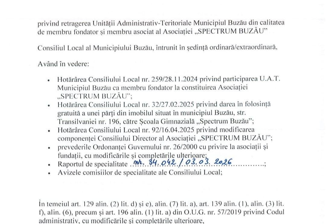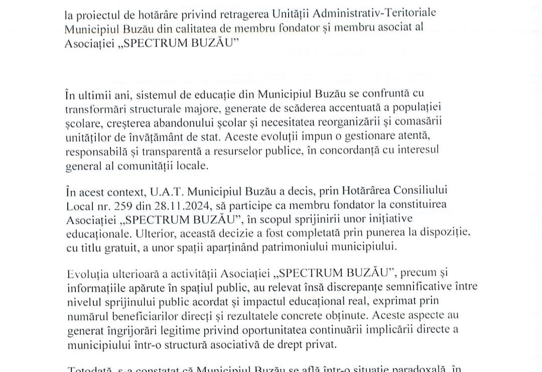Municipalitatea se află în fața unei decizii administrative majore, după ce consilierul Laurențiu Stâlpeanu a inițiat un proiect de hotărâre care vizează retragerea UAT Buzău din parteneriatul cu „Lumina Instituții de Învățământ” pentru funcționarea Școlii Spectrum. Subiectul, care a stârnit deja numeroase controverse, a intrat oficial în dezbatere publică pentru o perioadă de 90 de zile.