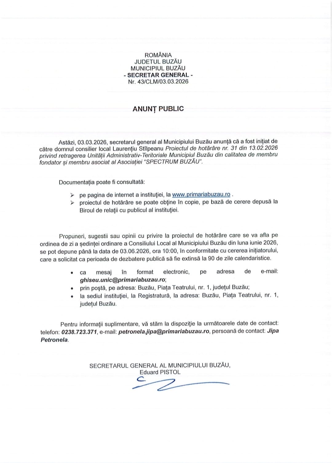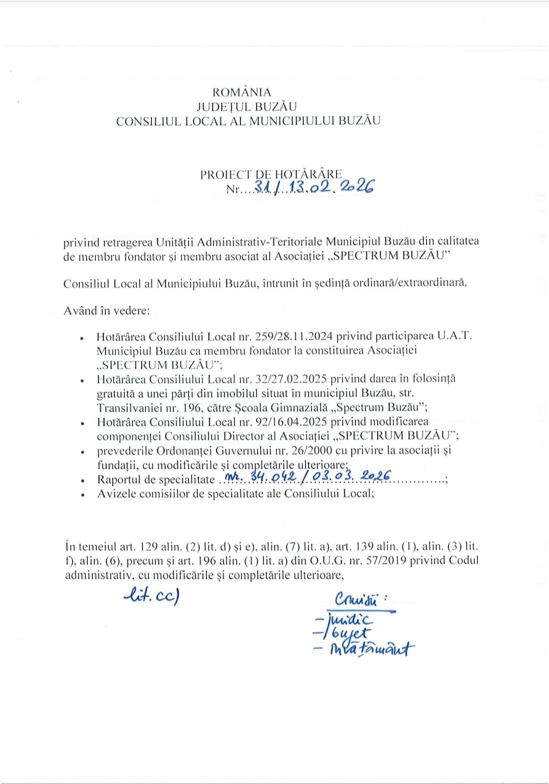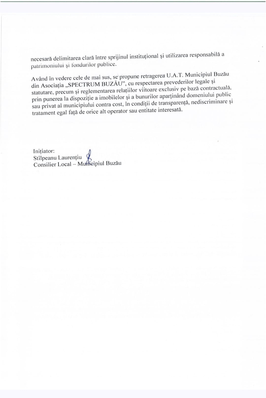 Municipalitatea se află în fața unei decizii administrative majore, după ce consilierul Laurențiu Stâlpeanu a inițiat un proiect de hotărâre care vizează retragerea UAT Buzău din parteneriatul cu „Lumina Instituții de Învățământ” pentru funcționarea Școlii Spectrum. Subiectul, care a stârnit deja numeroase controverse, a intrat oficial în dezbatere publică pentru o perioadă de 90 de zile.