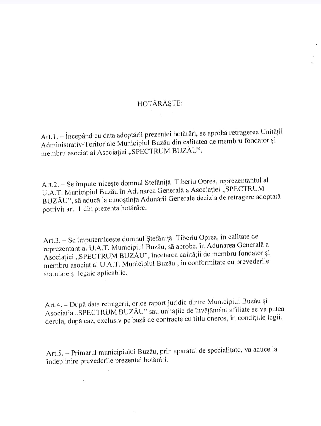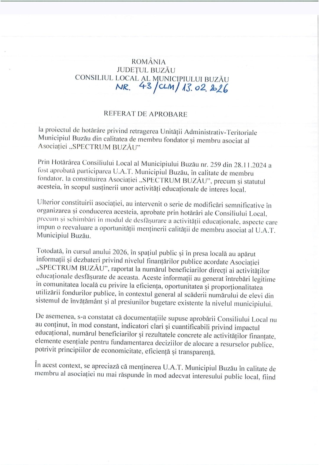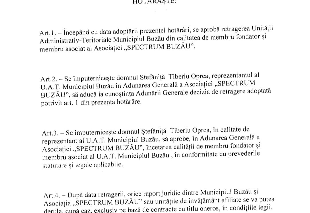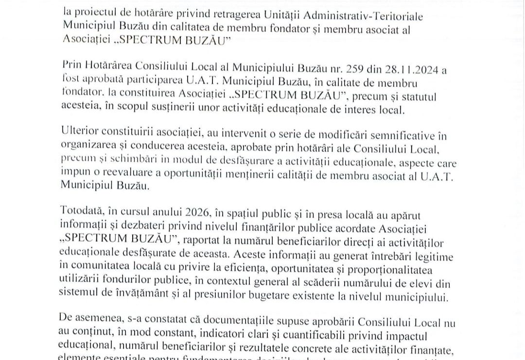 „Menținerea U.A.T. Municipiul Buzău în calitate de membru al asociației nu mai răspunde în mod adecvat interesului public local”, se precizează în referat.