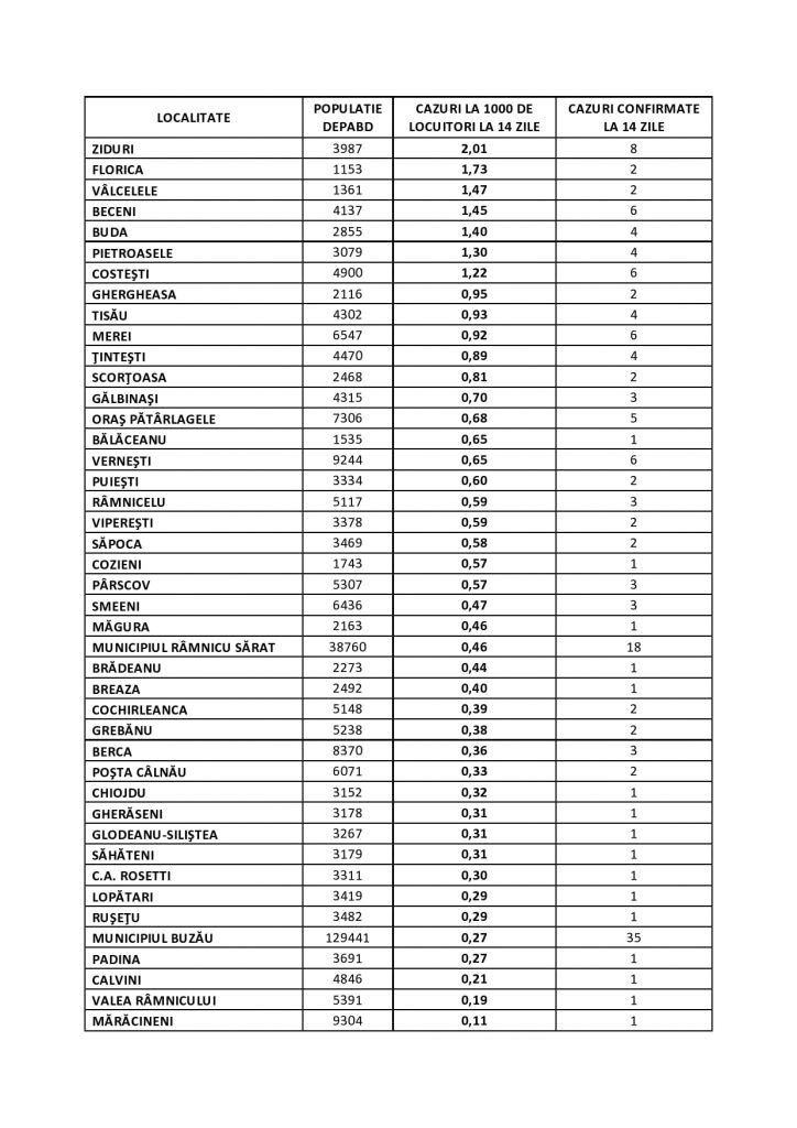 Concret, 42 de localități ale județului Buzău au luni, 3 ianuarie, rată de infectare zero. Și restul localităților stau destul de bine din punct de vedere al infectărilor, multe dintre ele având o singură persoană infectată cu coronavirus în ultimele 14 zile. Cea mai mare rată de infectare este la Ziduri. Aici, rata de infectare este 2,01 la mia de locuitori. Este și singura localitate din județul Buzău care are rată de infectare peste 2 la mie.