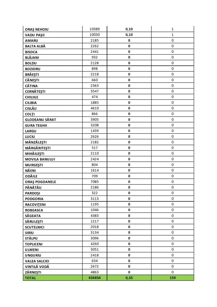 Județul Buzău începe anul 2022 cu rată de infectare aproape zero, mai exact 0,35 la mie. Aproape jumătate din localitățile județului au rată 0.