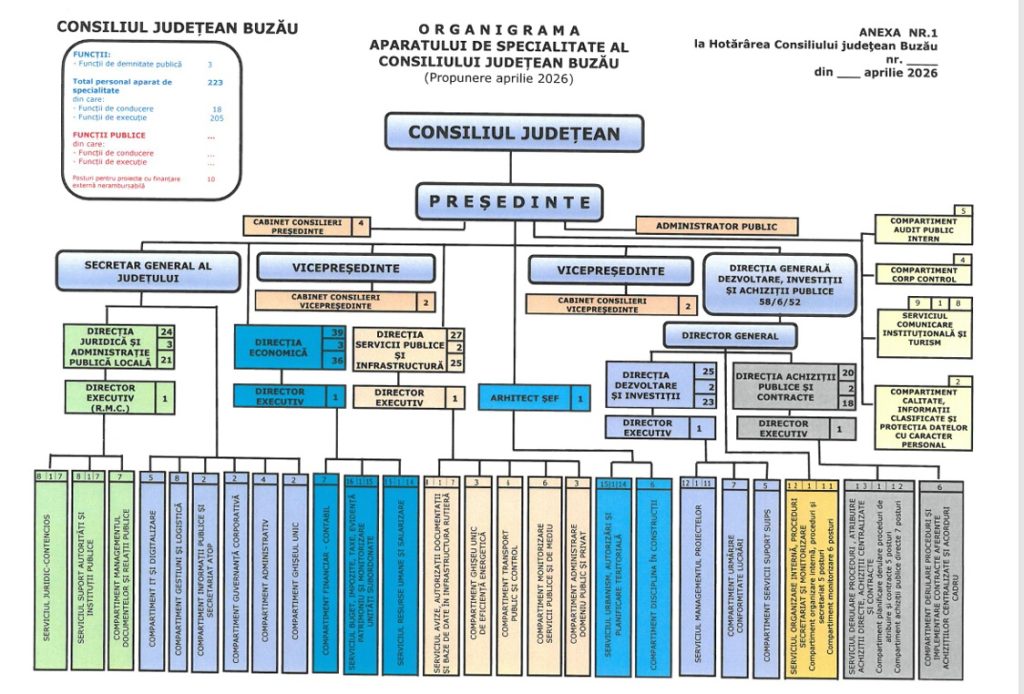 De altfel, imediat după ședința Consiliului Județean, a fost pusă în dezbatere publică organigrama propusă de Marcel Ciolacu, potrivit căreia aparatul de specialitate al instituției va avea 223 de posturi, dintre care 18 de conducere și 205 de execuție.